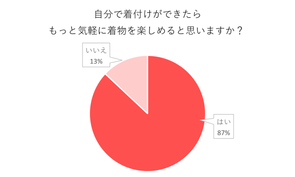「はい」が前項の回答よりも多く87%、「いいえ」が13%という結果に。着付けを覚えて一人で着られるようになったら着物を楽しめると感じる人が多いようです。