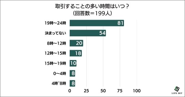 「取引することの多い時間はいつ?」とアンケート調査した結果、1位は『19時~24時』でした。