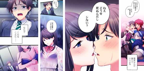 僕は学校の屋上から飛び降りようとしていた。この世界の主人公にはなれないって知ったから…。「どうせ死ぬんだし、シない?」そう言って僕を引き留めたのは、クラス一の美少女・三葉さんだった。憧れの彼女に誘われて、夢心地で肌を重ねて果てる僕。ところが気がつくと、僕は勇者として異世界転生していた!?美少女だらけのパーティに囲まれて、ようやく必要とされる世界に来ることが出来た!…と思っていたのに、ヤレばまた現実世界に飛んでしまうなんて…!そして、僕の悩ましくも刺激的すぎる異世界生活が始まった。