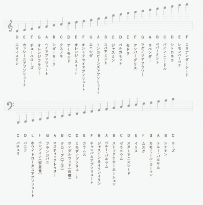 46種類の香料に、音階を当てはめたもの。揮発性の高い香りは高音に、低い香りは低音に割り当てられ、和音やオクターブ(高さの違う同じ音)ごとに心地良い香りになるよう設計されています。