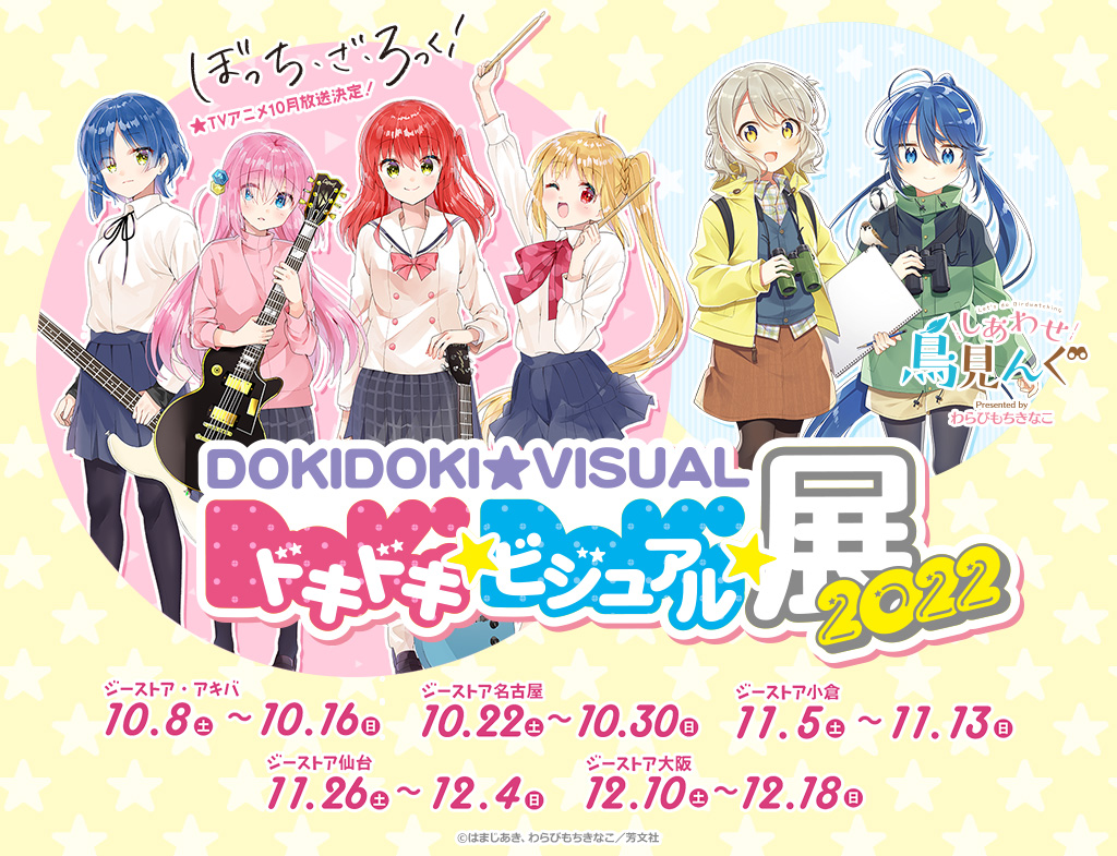 全国5カ所(秋葉原・大阪・名古屋・小倉・仙台)展開中のキャラクター・ライフスタイル・ストア「ジーストア」の運営などを手掛ける「タブリエ・マーケティング株式会社」は、10月8日(土)~オノデン本店4F「ジーストア・アキバ」が皮切りとなる『ドキドキ★ビジュアル★展覧会2022』を開催。全国5箇所のジーストアを巡回することを発表した。