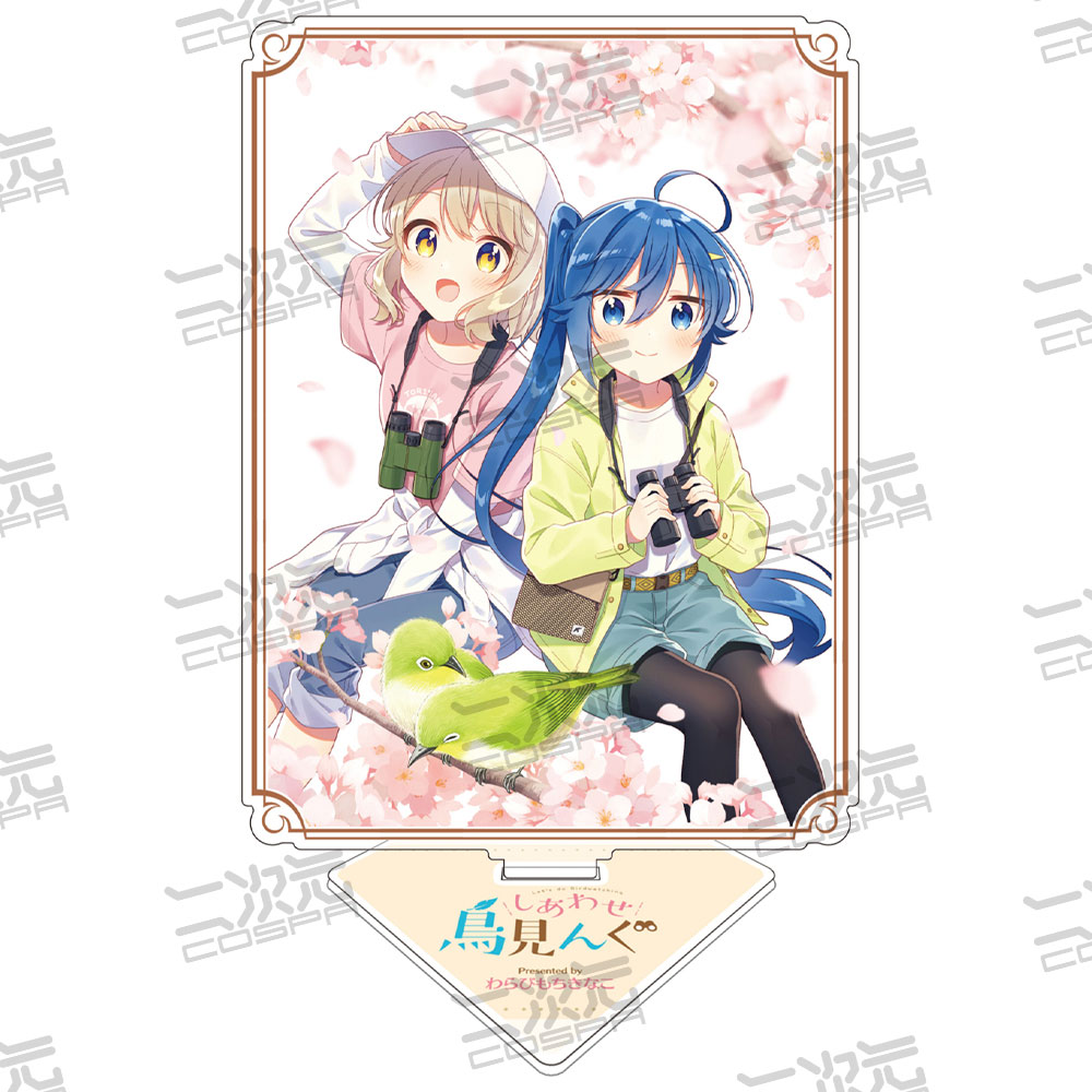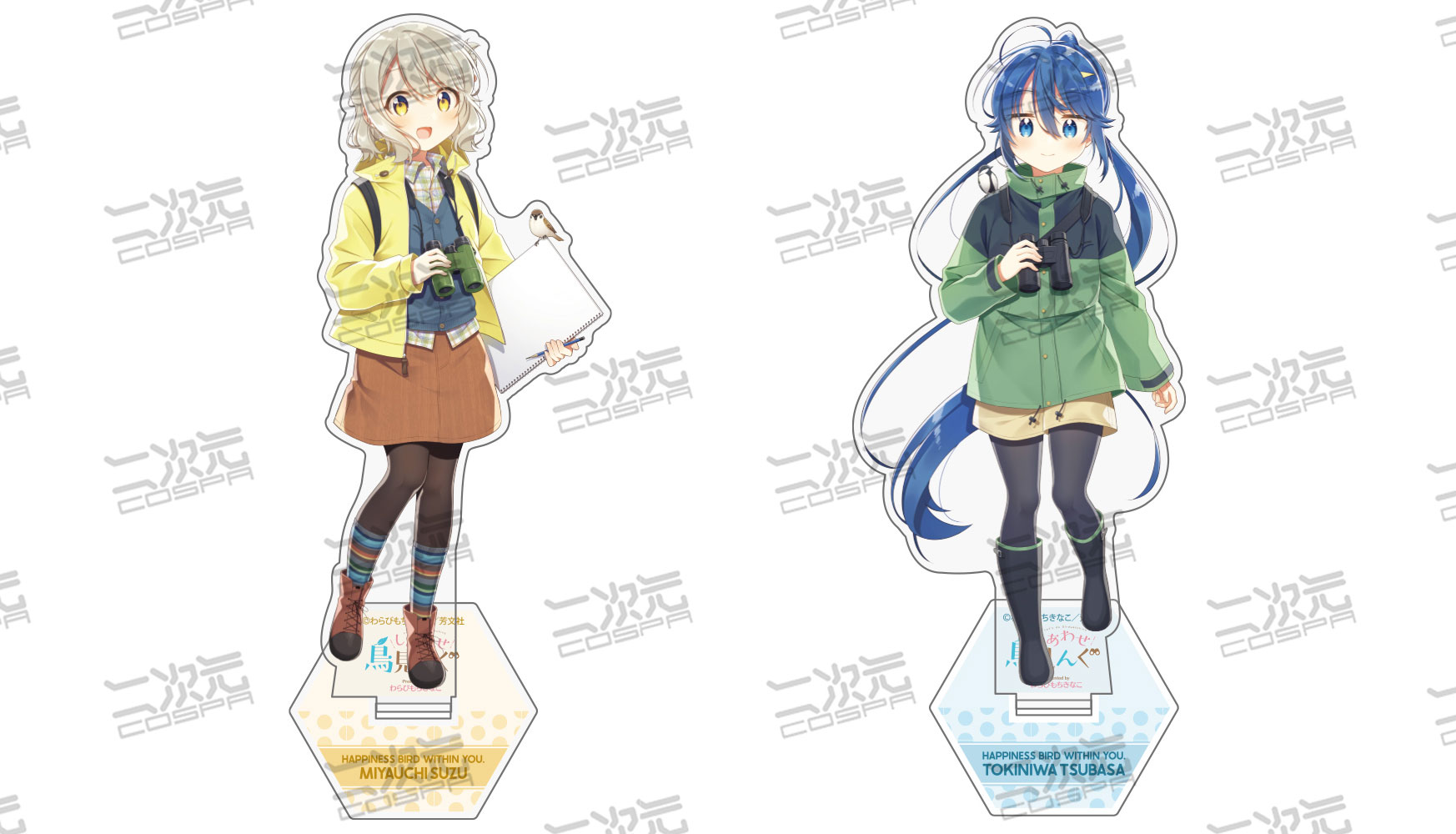「まんがタイムきらら」にて連載中の"わらびもちきなこ"先生による芸大生×鳥見ガチ勢のバードウォッチング4コマ『しあわせ鳥見んぐ』より、宮内すず、時庭翼の「アクリルスタンド」など新グッズが二次元コスパから登場いたします。