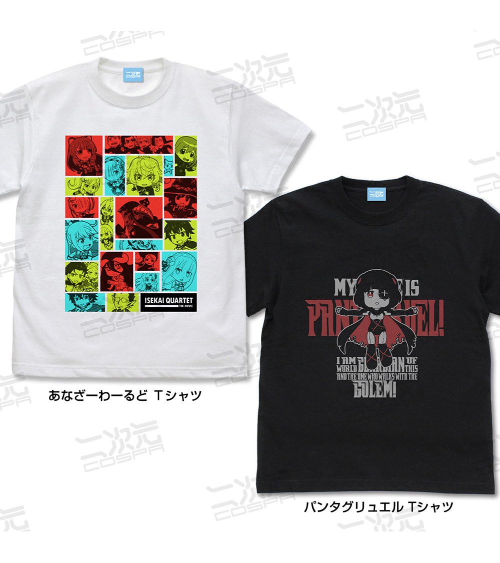 メインビジュアルを元にデザインした「あなざーわーるど Tシャツ」、異世界の護りびと「パンタグリュエル Tシャツ」、「レム」や「めぐみん」たちのアクリルマルチキーホルダーなど新商品が二次元コスパから登場。