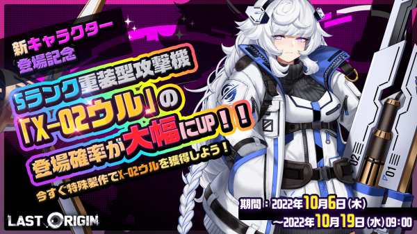SSランク重装型攻撃機「X-02ウル」の登場を記念して、「製作確率UPキャンペーン」を開催いたします!下記の期間中、「工房」の「特殊製作」にて「 X-02ウル」の出現確率が大幅にUPとなるのでこのチャンスをお見逃しなく!!