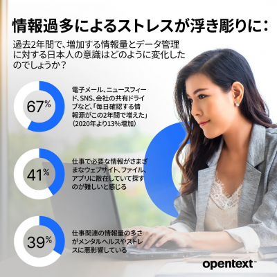 OpenText(NASDAQ:OTEX、TSX:OTEX、日本法人:東京都千代田区、代表取締役社長:反町浩一郎)は本日、「情報過多時代における実態調査」の結果を発表しました。本調査は、情報過多時代での仕事における影響や課題を明らかにすることを目的として、OpenTextが本社を置くカナダに加え、日本と欧州、北米、南米、アジア地域など12か国で実施され、日本では2,000人を対象に実施されました。今回の調査の結果、日本人の約7割(66.6%)が、電子メール、ニュースフィード、SNS、会社の共有ドライブなど、「毎日確認する情報源がこの2年間で増えた」と回答し、約4割(40.8%)が「仕事で必要な情報がさまざまなウェブサイト、ファイル、アプリに散在していて探すのが難しい」と感じると回答しました。