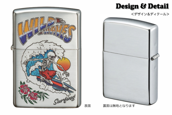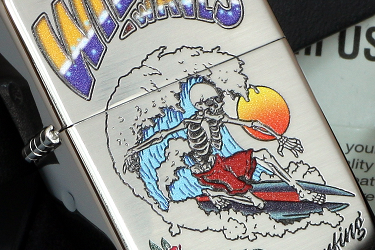 ワイルドウェーブ!サングラスの骸骨サーファーがゴキゲンに波乗り!Tシャツのようなエッジの効いたデザインで、日常で気軽に持てるカジュアルジッポ。遊び心のあるサーファーさんにオススメ。晴れな天気とオフショアのいい波でテイクオフ!!