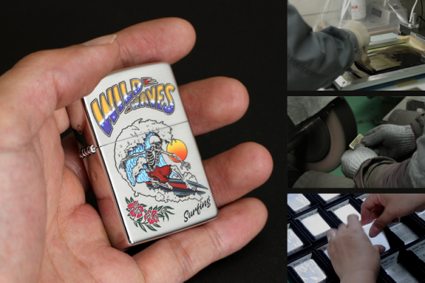 このジッポの装飾加工は、国内の工場で職人が一つづつ丁寧に仕上げています。 全体をヘアライン地にして落ちついた風合いに、またデザイン部分はエッチング加工で立体感をだしているので絵柄がくっきり見えるのが特徴。鮮やかなカラー装飾が爽やかなイメージをいっそう高めています。
