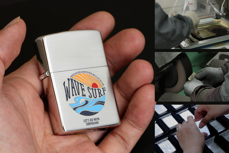 このジッポの装飾加工は、国内の工場で職人が一つづつ丁寧に仕上げています。 全体をヘアライン地にして落ちついた風合いに、またデザイン部分はエッチング加工で立体感をだしているので絵柄がくっきり見えるのが特徴。鮮やかなカラー装飾が爽やかなイメージをいっそう高めています。