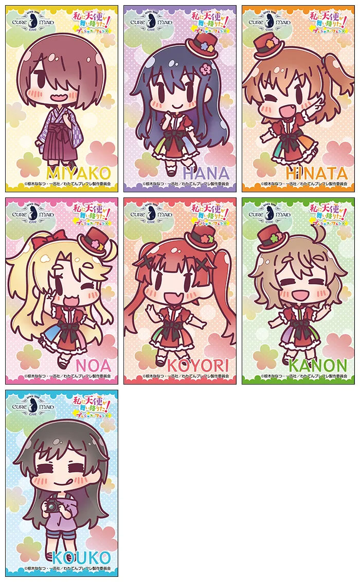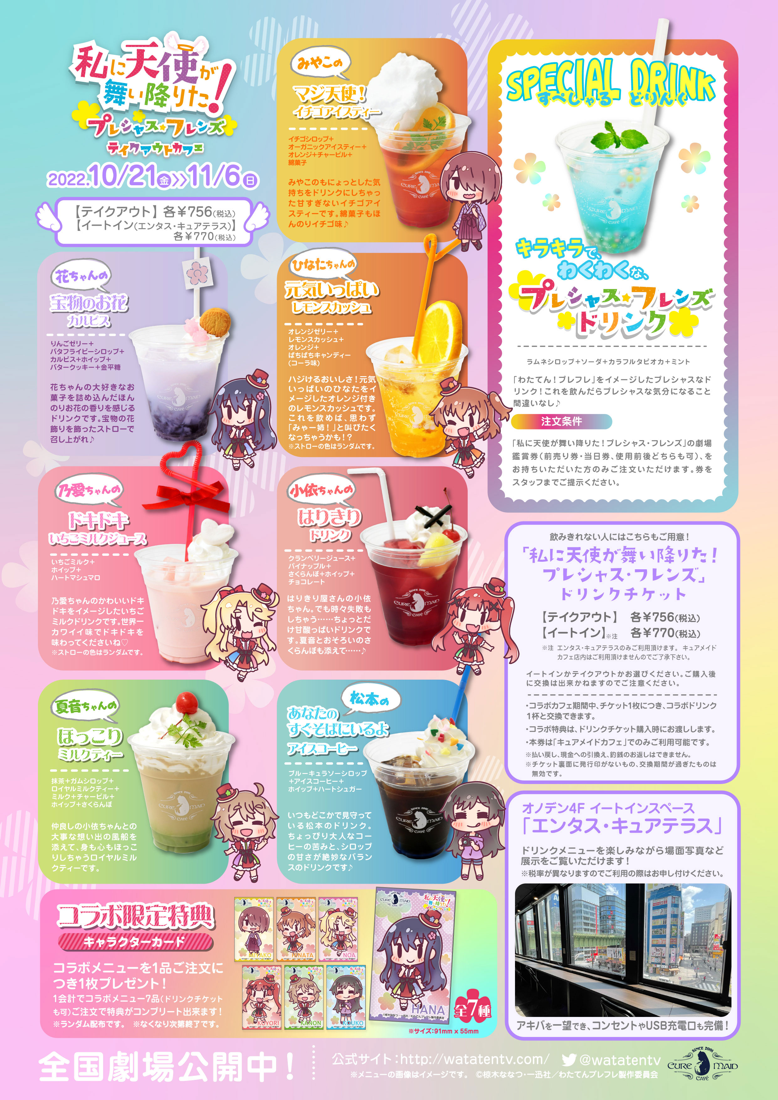 また、コラボドリンク1つご注文につき1枚プレゼントとなる【コラボ限定キャラクターカード(全7種)】や、キュアメイドカフェと同じオノデン本店4Fのイートインスペース「エンタス・キュアテラス」での場面写真展示など、『私に天使が舞い降りた!プレシャス・フレンズ』を劇場で見る前、見た後にもお楽しみいただけるコラボカフェとなっております。