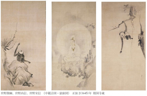 本展でご紹介するのはその探幽が二人の弟である尚信、安信と合作した《中観音図・猿猴図》という作品です。探幽が中心の観音像を、尚信が向かって右側の猿を、安信が向かって左側の猿を描いています。観音は白い衣をまとい、水辺の岩の上に座っています。光背が周辺を照らすように白く描き残され、周辺の竹林が光によっておぼろげに見えるのが分かります。柔らかい描線で、人々を救う存在である観音を穏やかに描きあげています。右側の猿は木にぶら下がって、恐らく池に映った月を取ろうとしているのでしょう。とても少ない筆数と墨の濃淡の使い分けで木やつる、猿の毛並みの様子などをうまく表しています。しがみつく子猿もかわいらしいですね。左側の猿はこちらも月を見上げ、指を指すような仕草を取ります。こちらの猿は右側の猿に比べて量感を感じさせます。岩や木の描写なども線の太さ、力強さが特徴といえます。しかし、三幅対全体を通して見ると余白を取り、軽やかな探幽らしさの表れた画面構成の優品といえます。ぜひ展示室で引き算の美といえる構成の妙、そして三者三様の描線の豊かさを実際にご覧ください。