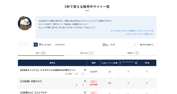・ラッコマーケット - 5秒でサイトが買える!リアルタイムサイト売買プラットフォーム