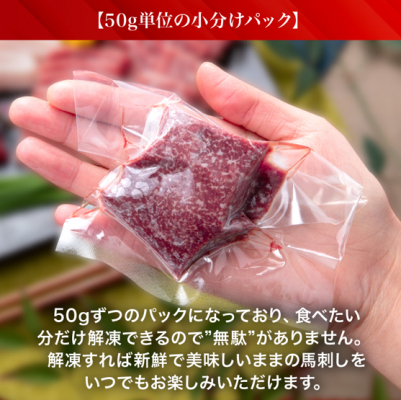 便利な小分けパックで食べたい分だけ解凍できるため、いつでも新鮮な馬刺しが食べられます。