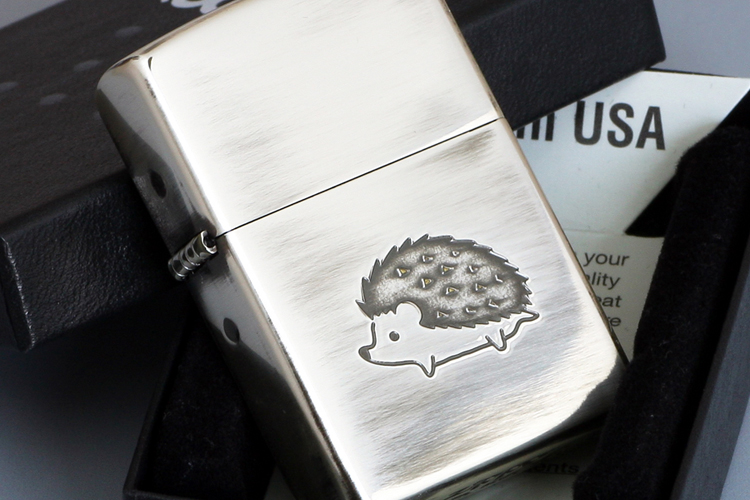 おなかはふわふわで、背中はツンツンしているかわいいハリネズミはペットとしても人気上昇中。見た目もコロンとしてかわいくて、トテトテと歩く姿も愛らしいハリネズミをジッポにエッチングでデザインしました。