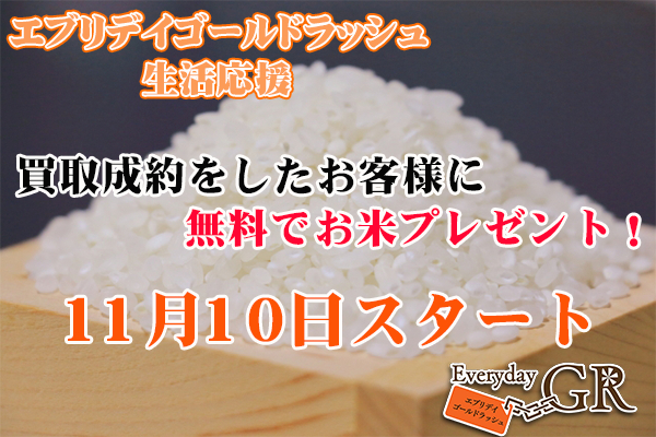 株式会社東洋(本社:埼玉県北本市 代表取締役/中村秀夫 )が運営する、埼玉県内10店舗展開の、県内売りたいリサイクルショップNO.1獲得(※2016年インターネットリサーチ)の「エブリデイゴールドラッシュ(以下、当社)」は、買取が成約したお客様を対象に11月10日から無料でお米をプレゼントします。
