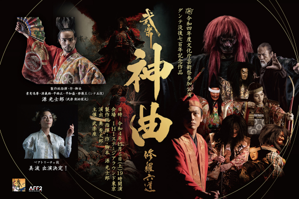 主演の源光士郎は、修羅王などシテ5役をすべて異なる能装束と武具で勤めあげ、作品テーマ「武の美」を勇壮に体現。重要な役割を果たすベアトリーチェ役の美波のほか、戦隊シリーズに出演後、映画・テレ ビ・舞台と多方面で活躍する南圭介が初演から3度目のダンテ役に。元HKT48の田島芽瑠は本物の甲冑を 着用して神功皇后役に再び挑んだ。