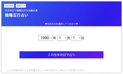 利用者は、自身の生年月日を選択することで利用料無料・登録不要で、信頼度の高いと言われる東洋占術『四柱推命』のなかから陰陽五行説を使った鑑定により、自身の陰陽五行が何なのかを知ることができます。