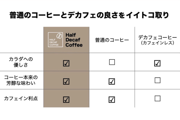 Half Decaf Coffeeは、カフェインがフルでもゼロでもない、ちょうど心地良いカフェイン量になっており、カフェインがもたらす利点と、しっかりとしたコーヒーの香りと味わいをダブルで楽しんでいただけるコーヒーです。