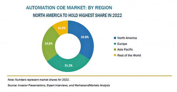 多くの企業で、財務、人事、販売、マーケティング、カスタマーサポートなどの業務に、統合および自動化技術を選択する傾向が強まっています。Work Automation Index 2022によると、北米では現在、66%の組織が5つ以上の部門でCOEプラットフォームを使用しており、7つの部門を自動化している組織の数は、2019年からほぼ3倍になりました。北米と欧州は、これらの地域の企業がトレンドの技術をいち早く採用していることから、相対的に大きなシェアを占めると予想されます。