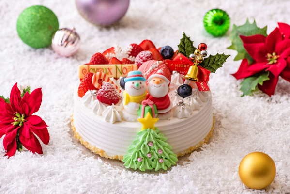 サンタクロースとスノーマンが仲良くプレゼントを運ぶ姿が愛らしいショートケーキです。フレッシュないちごをふんだんに飾り、しっとりと焼き上げた生地にもいちごをサンドしました。シェフが厳選した2種類の生クリームをブレンドした甘さ控えめのホイップクリームは、軽やかな口溶けです。側面には立体的なクリスマスツリーをデザインしました。