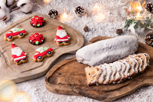 クリスマスを迎える4週間前から少しずつスライスして食べる習わしのあるドイツ伝統菓子のシュトーレンを、本格的なレシピで焼き上げました。ラム酒と「V.S.O.P」のブランデーに漬け込んだオレンジピール、レモンピール、レーズンのドライフルーツや、オーブンで空焼きしたアーモンド、鼻から抜けるミックススパイスの芳醇な香りが、クリスマスの訪れを感じさせます。中央にアーモンドパウダーと砂糖を練り込んだマジパンを入れることで、甘みとアーモンドの風味が加わります。贅沢にたっぷりとバターに漬け込んだ後、バニラが香るグラニュー糖を纏わせ、1日置いてから、粉糖をかけて仕上げます。シェフのこだわりで、8mmにスライスすると、一番美味しく食べられるよう、ドライフルーツのカットサイズや量を調整しています。コーヒーや紅茶はもちろん、本場ドイツのように赤ワインと合わせると、大人のクリスマスの雰囲気を感じていただけます。