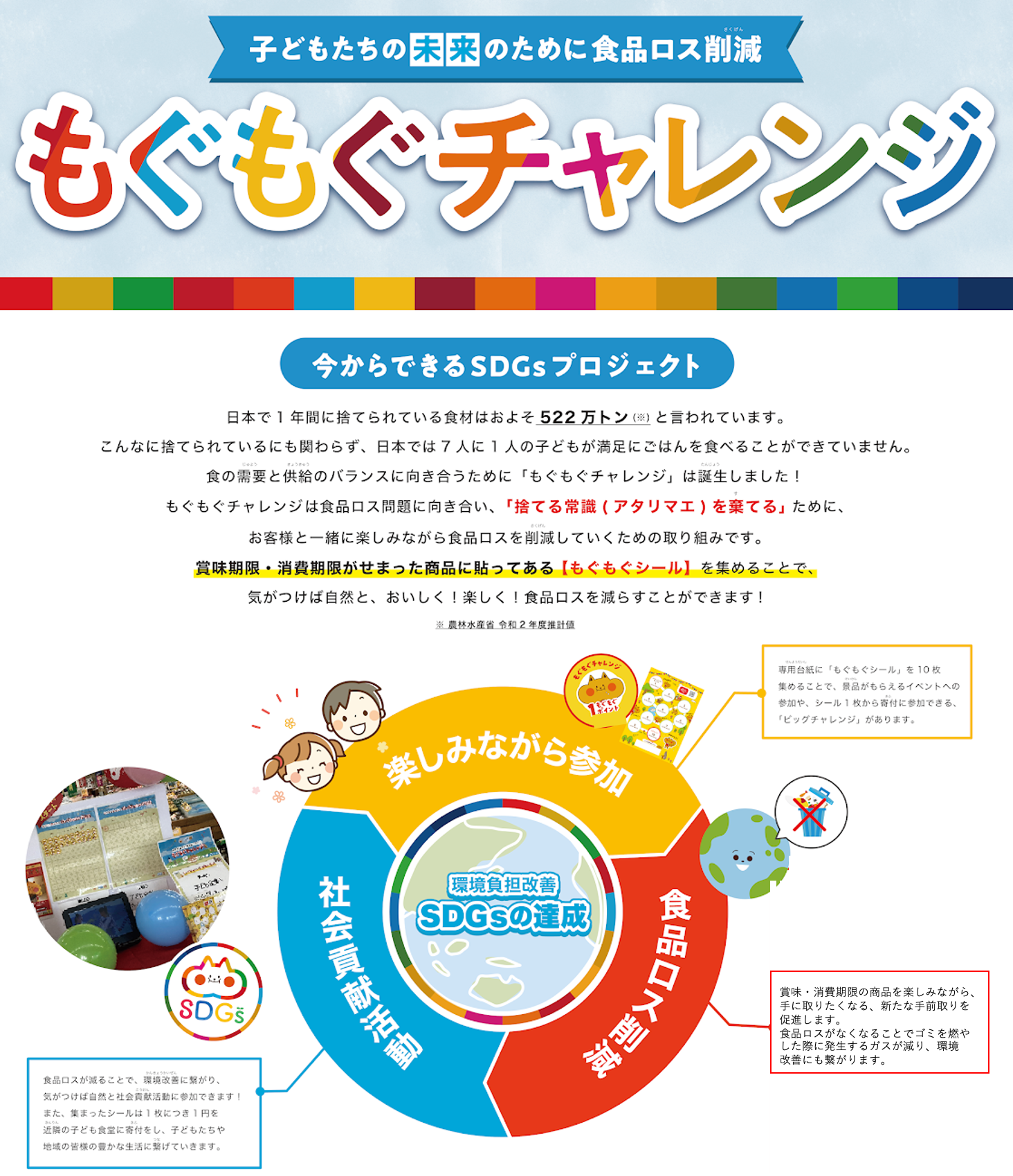 大人も子どもも楽しく「食品ロス削減」に取り組むことができるように、主にスーパーマーケットの店内にて実施している活動です。賞味期限・消費期限が迫った商品に貼られている「もぐもぐシール」を集めることで、地域のこども食堂等に寄付することもでき、気がつけば自然と食品ロス削減に貢献ができます(※寄付先や実施内容の詳細についてはお問合せください)。