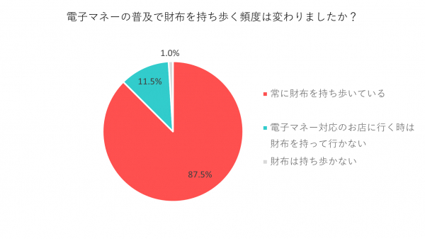 最も多かったのが「常に財布を持ち歩いている」で87.5%、次いで「電子マネー対応のお店に行く時は財布を持って行かない」11.5%、「財布は持ち歩かない」1%でした。