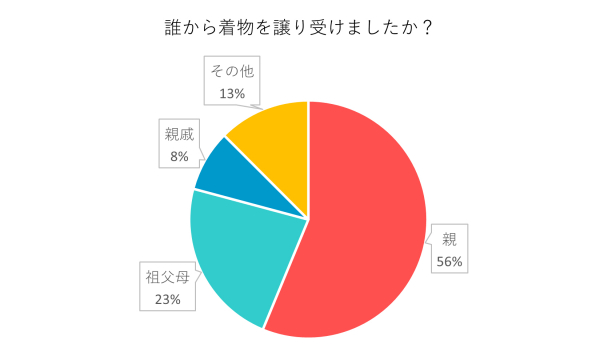 「親」と答えた人が最も多く56%、次いで「祖父母」23%、「親戚」8%、「その他」13%という結果に。「母の思い出の品をもらえたのが嬉しかった」「母が成人式に着た着物を自分の成人式の際に譲り受けた」「自分で着られるようになりたい」といった声が多く上がりました。
