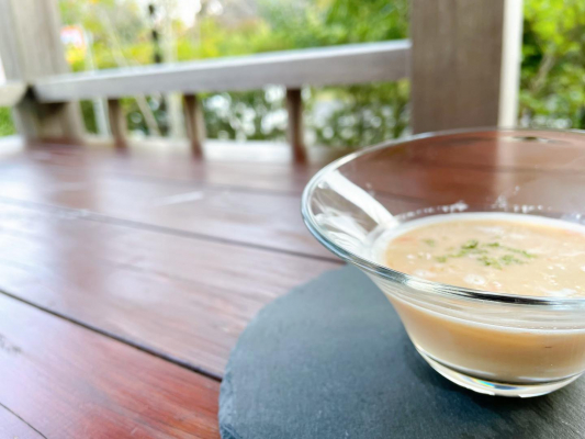 大豆・ゴマ・エノキ・玉ねぎ・海藻類をベースに、酵素をそのまま活かしたファイトケミカルがたっぷり溶け込んだポタージュスープです。かき氷を食べる前に飲んでいただければ、大人のごほうび氷が美味しく召し上がっていただけます。