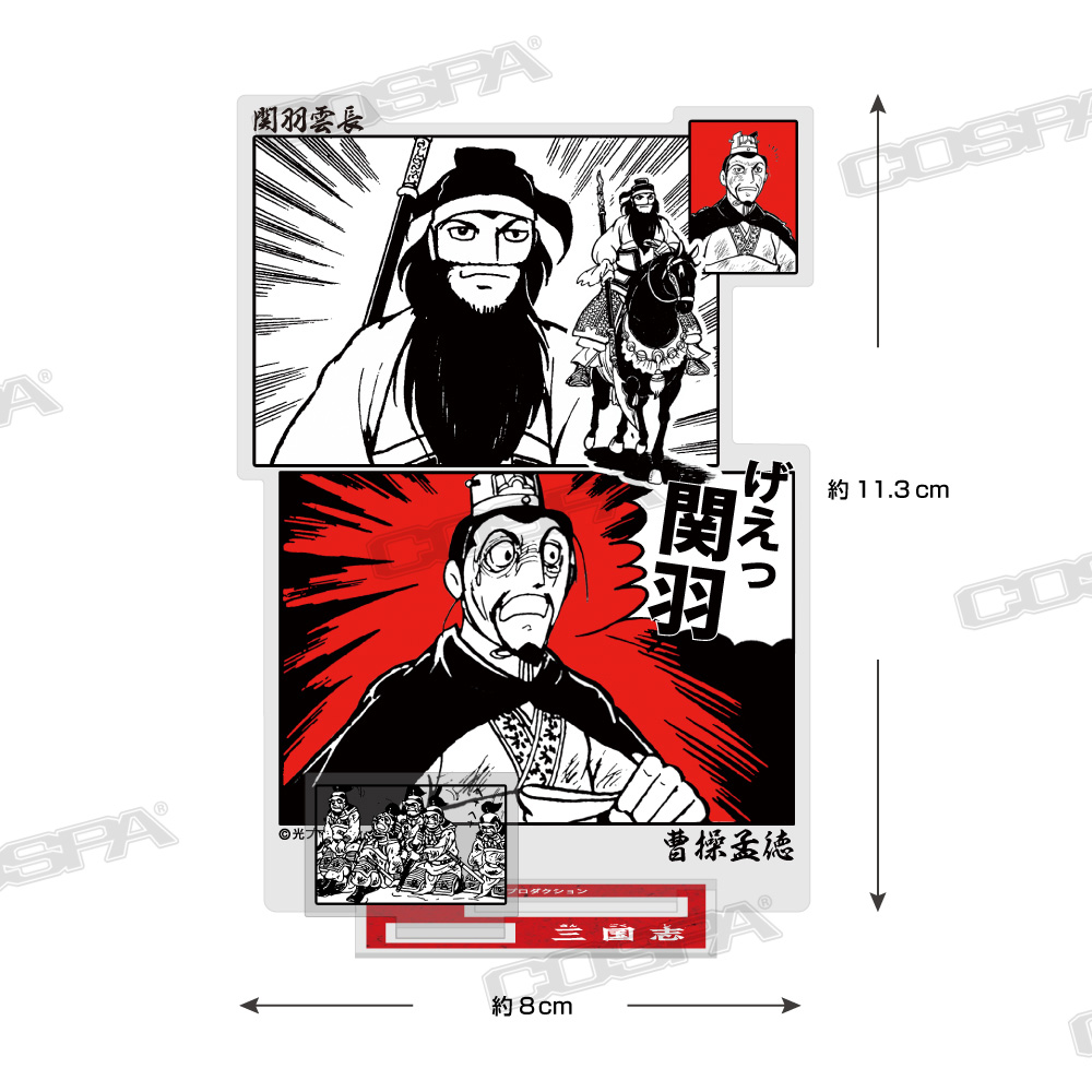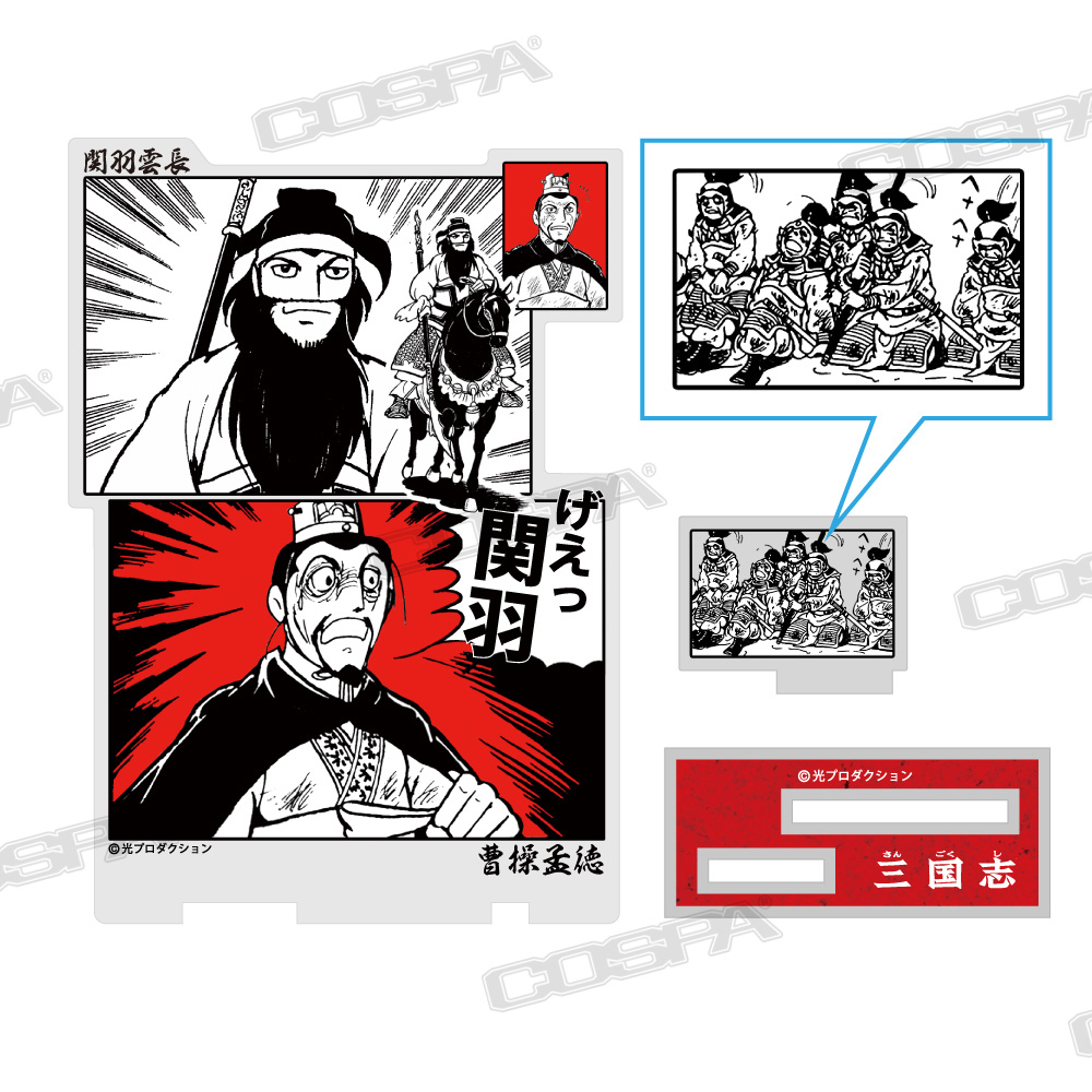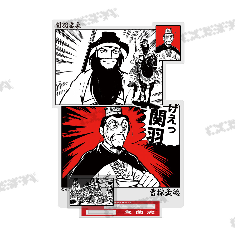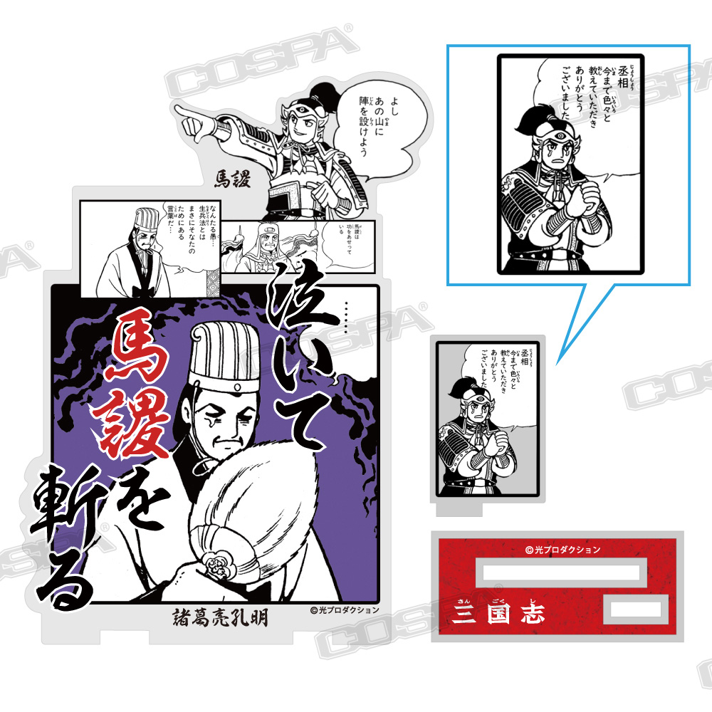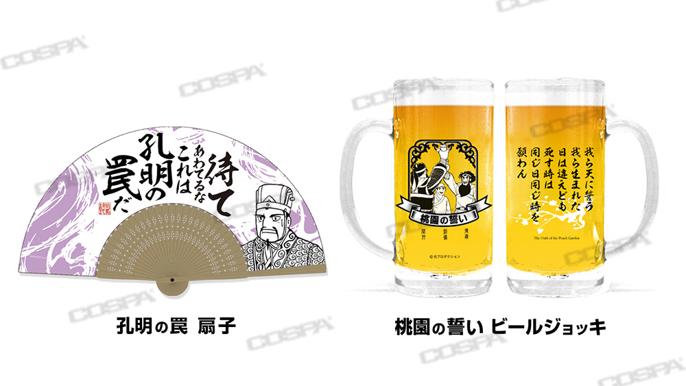 歴史漫画の名作『三国志』より、「関羽のそんなものはない」「伏龍と鳳雛」Tシャツ、「げぇっ 関羽」「泣いて馬謖を斬る」アクリルスタンド、「孔明の罠」扇子、「桃園の誓い」ビールジョッキなど新商品がCOSPA(コスパ)より登場。
