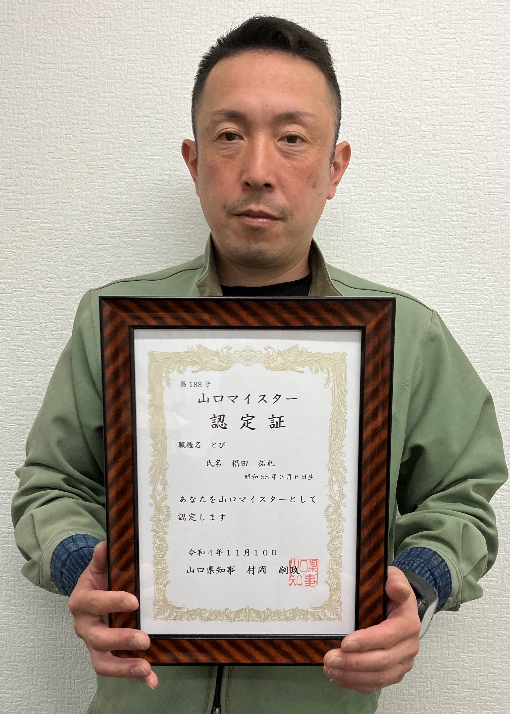 有限会社栗栖工業(本社:山口県宇部市、以下 当社)社員の、椙田拓也(すぎたたくや42歳)は山口県が認定する、優れた技能を持ち次世代技能者育成に意欲がある者(今年度は12名)を認定する「山口マイスター」に選ばれました。2022年(令和4年)11月10日に、県のホームページなどに公表され、認定証が本人宛に送られました。