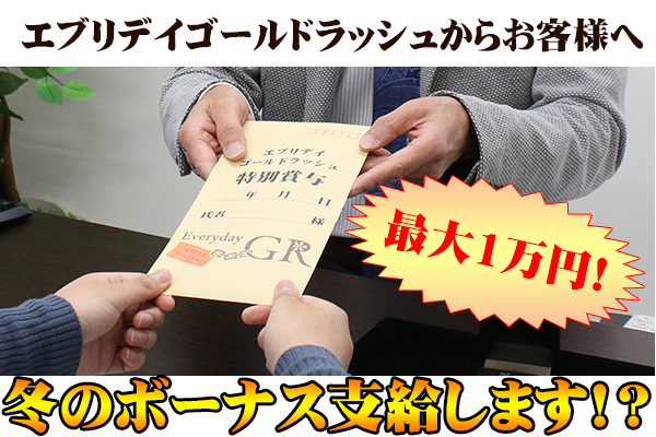 株式会社東洋(本社:埼玉県北本市 代表取締役/中村秀夫 以下、当社)が運営する、埼玉県内10店舗展開の、県内売 りたいリサイクルショップNO.1獲得(※2016年インターネットリサーチ)の「エブリデイゴールドラッシュ」では、12月1日から12月20日の間で1万円以上の売却成約をした方を対象に冬のボーナス(買取上乗せ金額)を支給(お渡し)致します。