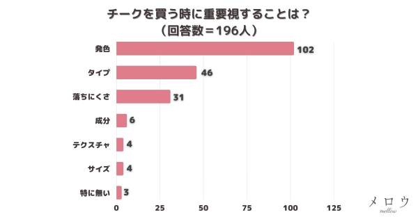 「チークを買う時に重要視することは?」とアンケート調査した結果、1位は『発色』でした。