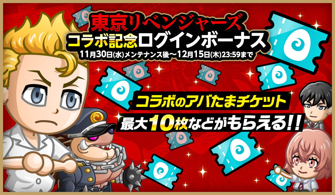 『東京リベンジャーズ』とのコラボイベント開催を記念して、「コラボのアバたまチケット」最大10枚などがもらえる「ログインボーナス」を開催いたします。コラボのアバたまチケットを使ってコラボ限定キャラを手に入れましょう!