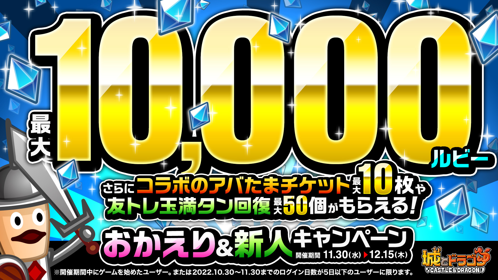11月30日(水)より、対象ユーザーに最大10,000ルビーやコラボのアバたまチケット最大10枚などが贈られる「おかえり&新人キャンペーン」が開催いたします。