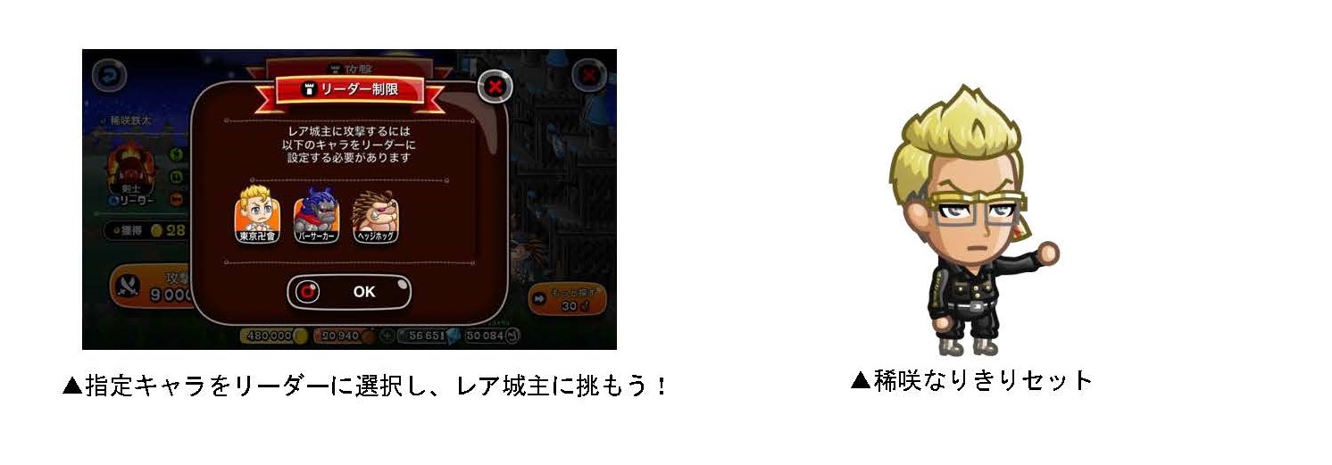 「バトル」から「ひとりで」または「みんなで」を選び、「攻撃」を選択すると、ランダムでレア城主が出現する“レア城主”イベント。「稀咲の野望を砕け!」では、まれに稀咲鉄太に扮した剣士と遭遇し、規定数勝利をすると剣士用限定お着替え「稀咲なりきりセット」がもらえます。