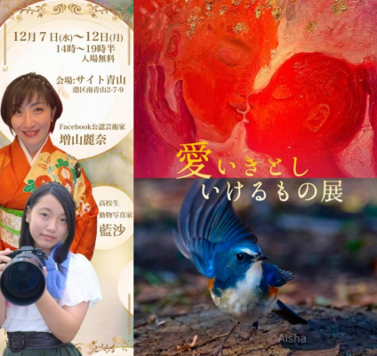 史上最年少で第37回「日本の自然」写真コンテストで朝日新聞社賞を受賞し、毎日こども新聞で連載、NHKでも特集されるなど注目の高校生動物写真家、藍沙氏と、Facebook公認画家でAIアート共生芸術がドバイ国際アート展にも参加が決まった岡本太郎賞アーチスト、増山麗奈氏の2人展が、東京青山一丁目の「サイト青山」で、12月7日~12日まで開催する。