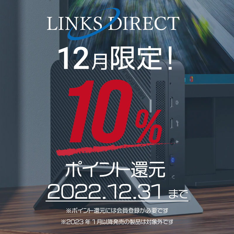株式会社リンクスインターナショナル(本社:東京都千代田区、代表取締役:川島義之)は、直販サイト「リンクスダイレクト」にて、新品のミニPC・モバイルPCなど全製品を対象に10%のポイント還元キャンペーンを2022年12月1日から2022年12月31日まで開催いたします。