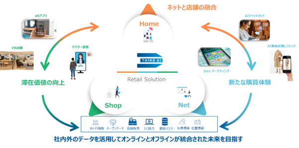 Third AI Retail Solutionでは、実店舗と同等の購買体験をいかにECサイトで提供するか、そして、いかに実店舗で購買データを収集するか、といった課題を解決するOMOの推進を支援します。