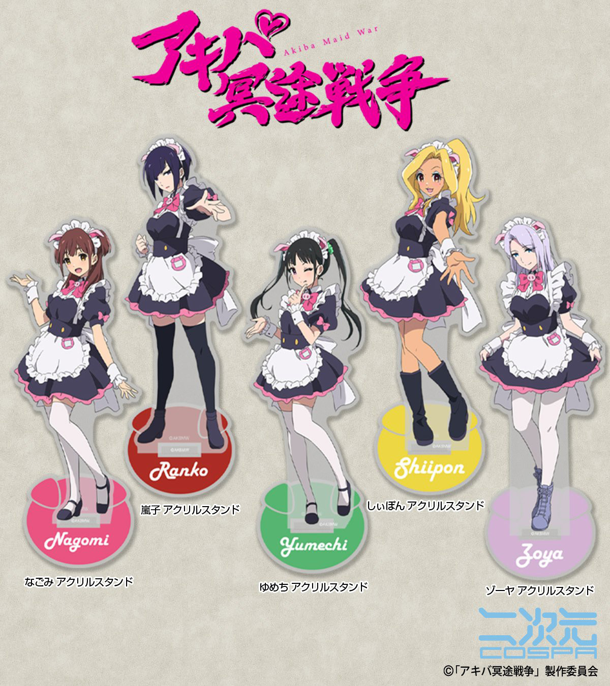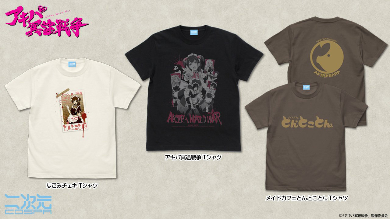 『アキバ冥途戦争』より、「なごみ」「嵐子」「ゆめち」「しぃぽん」「ゾーヤ」のアクリルスタンド、「メイドカフェとんとことん」「なごみチェキ」Tシャツなど新商品が二次元コスパから登場。