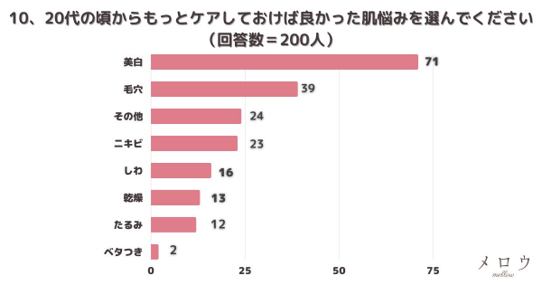 「10、20代の頃からもっとケアしておけば良かった肌悩みを選んでください」とアンケート調査した結果、1位は『美白』でした。