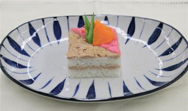 作品概要:大阪の郷土料理である大阪寿司(箱寿司)を取り上げ、手に入りにくくなった「なまぶし」を、缶詰めのかつおフレークで代用し、ハードルの高そうな箱寿司を簡便に作れるようにした。すし飯の塩、具の醤油を一切使用せず、うま味調味料を活用し、大胆に減塩した。