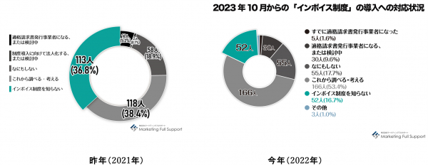 来年10月の制度導入まで1年を切った「インボイス制度」については、「これから調べる・検討する」が過半数を占め対応が先送りされている状況が浮き彫りになりました。一方で、「知らない」については昨年の36.8%から今年は16.7%に減少し認知度は向上してきているようです。