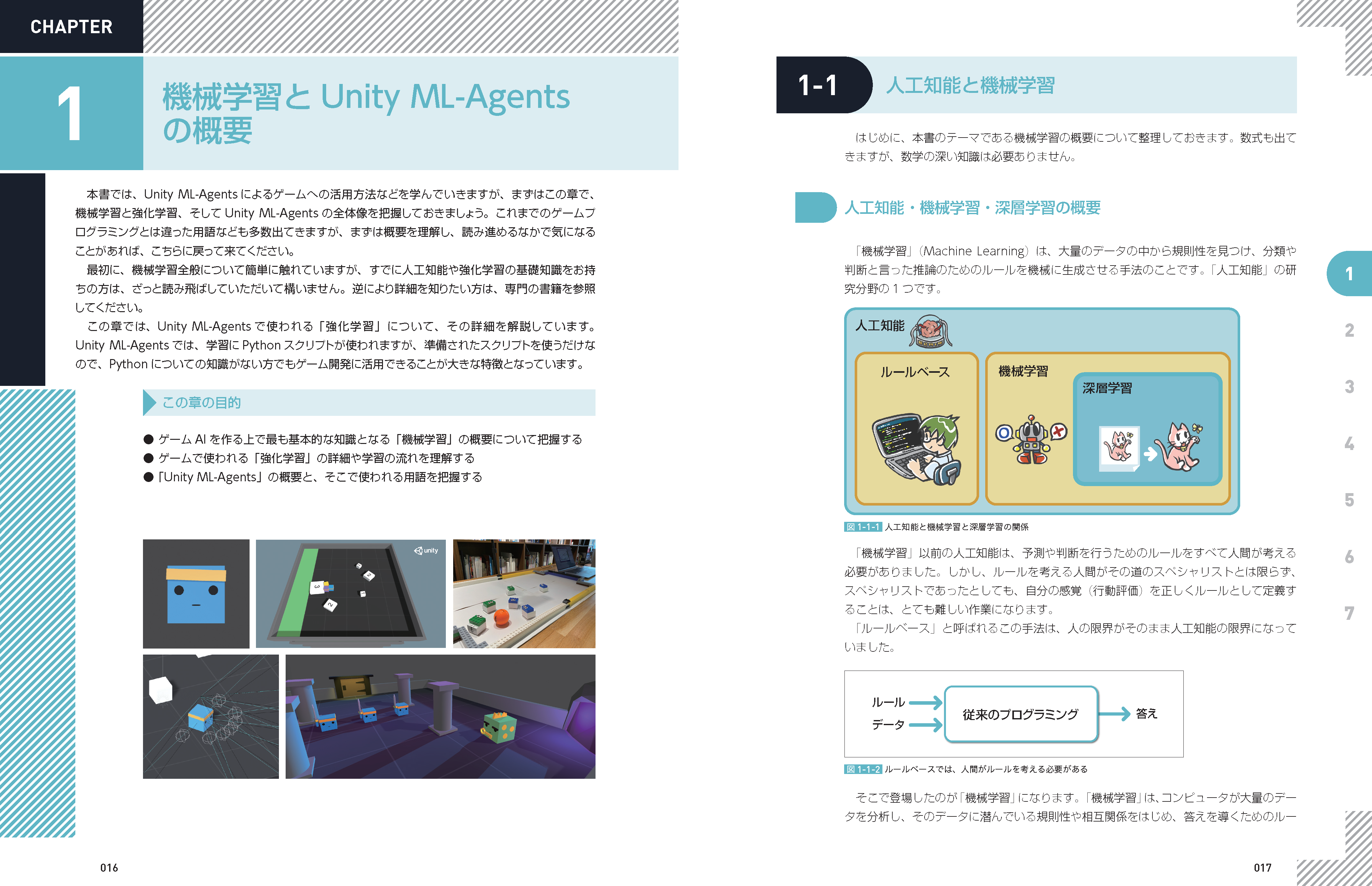 本書では、はじめて「機械学習」にチャレンジする方から学んでいただけるように、機械学習の仕組みや学習方法の基礎から、サンプルプログラムを使った実践まで、ていねいに解説しました。また、AIを組み込んで活用する応用事例も多数掲載しており、ゲーム開発の現場ですぐに役立てることができます。