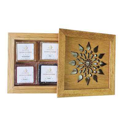 職人が手作業で制作した木箱に石鹸を詰め合わせたセット。仕切りがあるので、ジュエリーボックスとしても使えるデザインです。