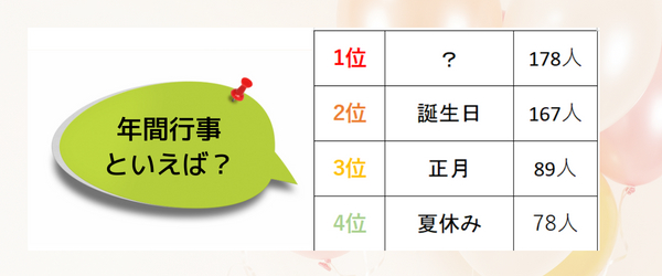 89%が「クリスマス」、83.5%が「誕生日」、44.5%が「正月」、39%が「夏休み」、31%が「家族旅行」、24.5%が「冬休み」と回答した。クリスマスや誕生日と答える人が多く、これはプレゼントがもらえることが影響しているのではないかと考えている。また、1/3が家族旅行と回答しているが、今後コロナの感染状況によってどのように変化していくのかを追っていきたい。