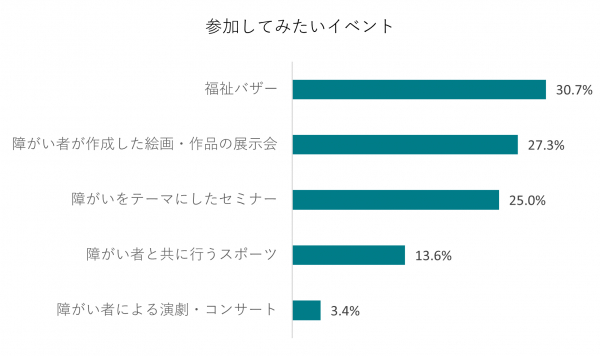 「福祉バザー」30.7%、「障がい者が作成した絵画・作品の展示会」27.3%、「障がいをテーマにしたセミナー」25%、「障がい者と共に行うスポーツ」13.6%、「障がい者による演劇・コンサート」3.4%でした。
