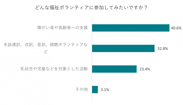 「障がい者や高齢者への支援」40.6%、「手話通訳、点訳、音訳、傾聴ボランティアなど」32.8%、「乳幼児や児童などを対象とした活動」23.4%、「その他」3.1%でした。