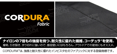 ・ナイロンの7倍もの強度を持つ、耐久性に優れた繊維、コーデュラ(R)を使用。摩耗、引き裂き、すり切れに強いので、普段使いにはもちろん、アウトドアでの使用にもオススメ。