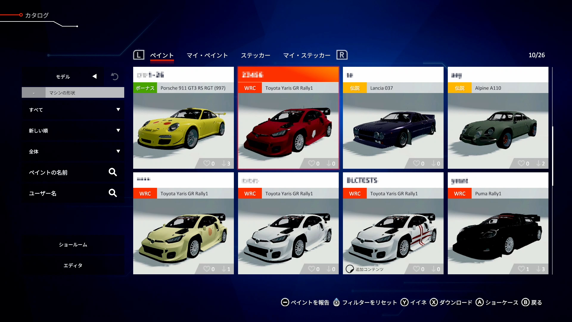 その他にも、世界のプレイヤーのリザルトが表示される「ランキング」の閲覧や、他のプレイヤーが編集して公開したオリジナルのペイントを検索できる「カタログ」から好きなデザインを見つけて「イイネ」ボタンを押して投票したり、ダウンロードして使用する事も可能になります。