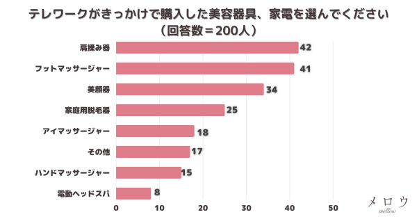 ARINA株式会社が運営する20代~50代18人の女性による美容レビューサイト「mellow-メロウ-」(https://arinna.co.jp/mellow/)は、日本全国18歳以上の方を対象に「テレワークがきっかけで購入した美容器具、家電を選んでください」とアンケート調査を実施しました。その結果を公表します。